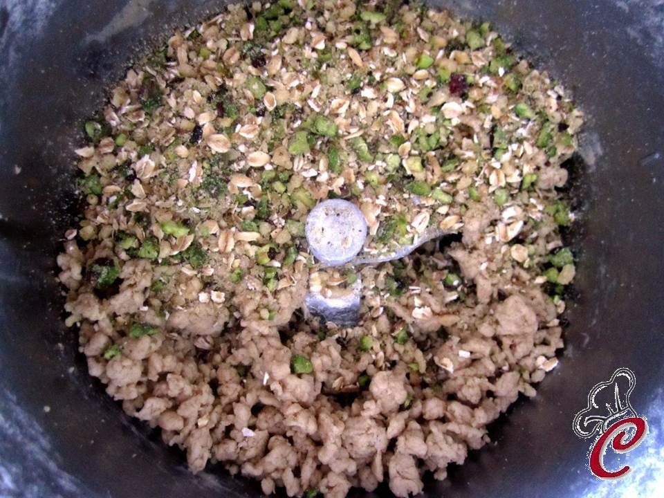 Inserite in un boccale pistacchi, noci e fiocchi d’avena. Tritateli grossolanamente, quindi teneteli da parte.