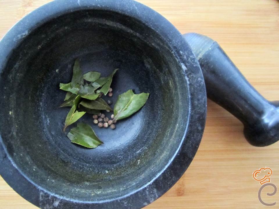 Nel frattempo pestate, in un mortaio, i grani di pepe per il risotto insieme alle foglie di alloro e aggiungetele in una padella, in cui avrete fatto scaldare l’olio. Lasciate insaporire, a fiamma bassa, per un paio di minuti.