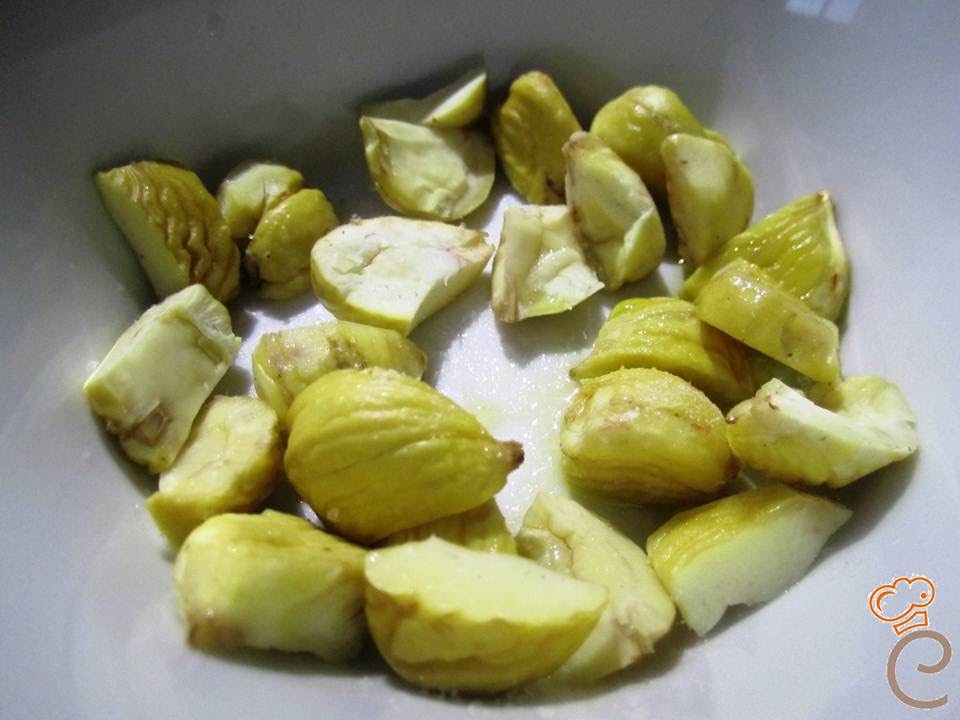 Mondate i cavoletti, pulite le castagne crude eliminando la pellicina e cuocete tutto al vapore. Io non eccedo mai con i tempi di cottura, per non compromettere le proprietà dell'ortaggio. Raffreddate i cavoletti subito dopo la cottura, quindi teneteli da parte, insieme alle castagne.
