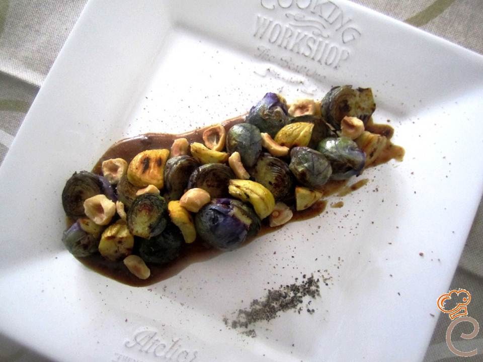 Versate su un piatto la salsa alle acciughe, creando una base. Sistematevi sopra castagne e cavolini, unite le nocciole leggermente pestate al mortaio e spolverizzate con pepe e