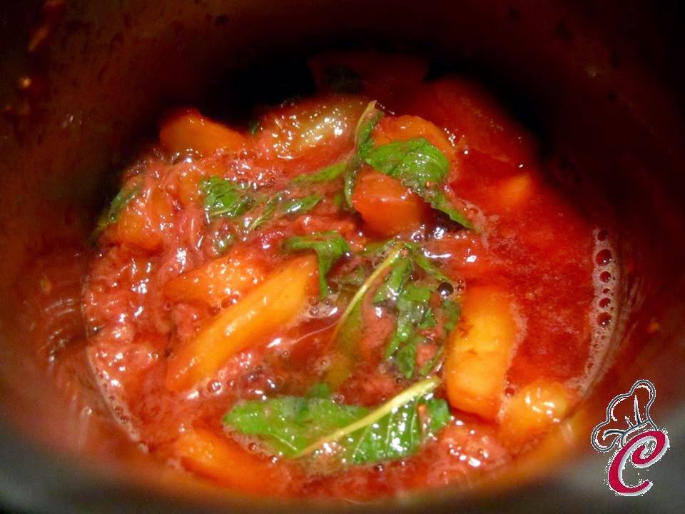 Lavate 8 fregole e tagliatele a pezzi. Mettetele in un pentolino insieme all'ananas tagliata in piccoli spicchietti. Portate tutto ad ebollizione. Una bolta raggiunto il bollore, abbassate la fiamma e cuocete per circa 15 minuti. Spegnete il fuoco, aggiungete le foglie di menta nìben lavate e passate tutto con un frullatore ad immersione, ottenendo una crema non troppo liscia. Tenete da parte fino a raffreddamento (potrete preparare questa salsa anche il giorno prima). In questo modo i sapori si armonizzeranno e la menta darà il suo tocco inconfondibile.