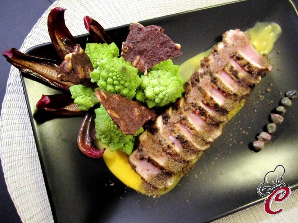 Scaldate una padella con un filo di olio evo. Nel frattempo eliminate la marinatura dai filetti di vitello e massaggiateli ancora un po'. Adagiateli nella padella rovente e fateli cuocere per 2/3 minuti per lato, in modo da rosolarli bene in superficie, ma lasciandoli rosati all'interno. Quando saranno pronti trasferiteli su un tagliere e tagliateli a fettine spesse circa un centimetro. Adagiate ciascun filetto tagliato su un piatto, sopra la salsa al maracuja. Rifinite con emulsione alle acciughe e polvere di capperi e accompagnate con verdura al vapore e cialde croccanti. Io ho utilizzato dei crackers al riso nero, ma..... ve ne parlerò in un'altra occasione ^_^