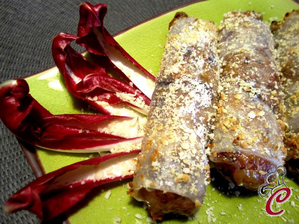 Tritate le mandorle, grossolanamente, e tenetele da parte. Bagnate leggermente gli involtini, quindi passateli nelle mandorle, facendo aderire perfettamente la panatura. Irrorateli con un filo di olio.