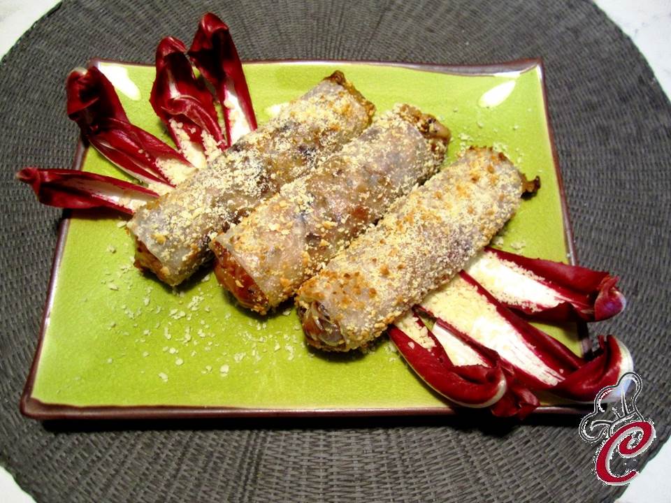 Quando saranno dorati estraeteli dal cestello (o dal forno) e trasferiteli su un piatto, insieme a del radicchio fresco.